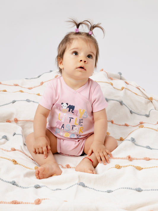 Short Sleeve Wrap Front Bodysuit with (Masterpiece) Phrase Graphic - Pink