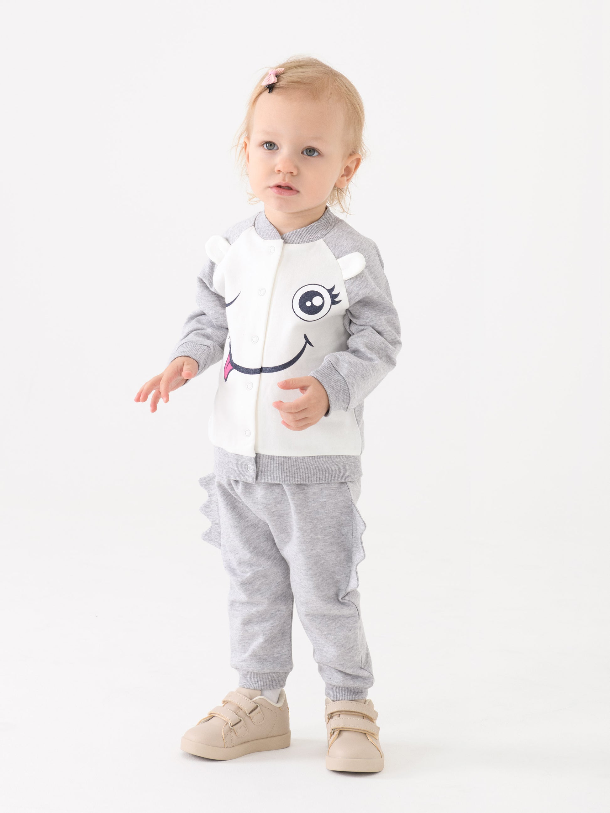 Feeling the need to get your little one something cozy and cool, but don't have time for shopping? You're in luck! This bomber jacket is an instant fix - ideal for kids with its perfect, comfy fit, this stylish bomber will keep your angel nice and warm. The material is 100% natural cotton and feels soft to the skin. Illustrated with a friendly green monster face on the front and two cute ears, this bomber in eye catching white and grey colors is the perfect add on for the season.