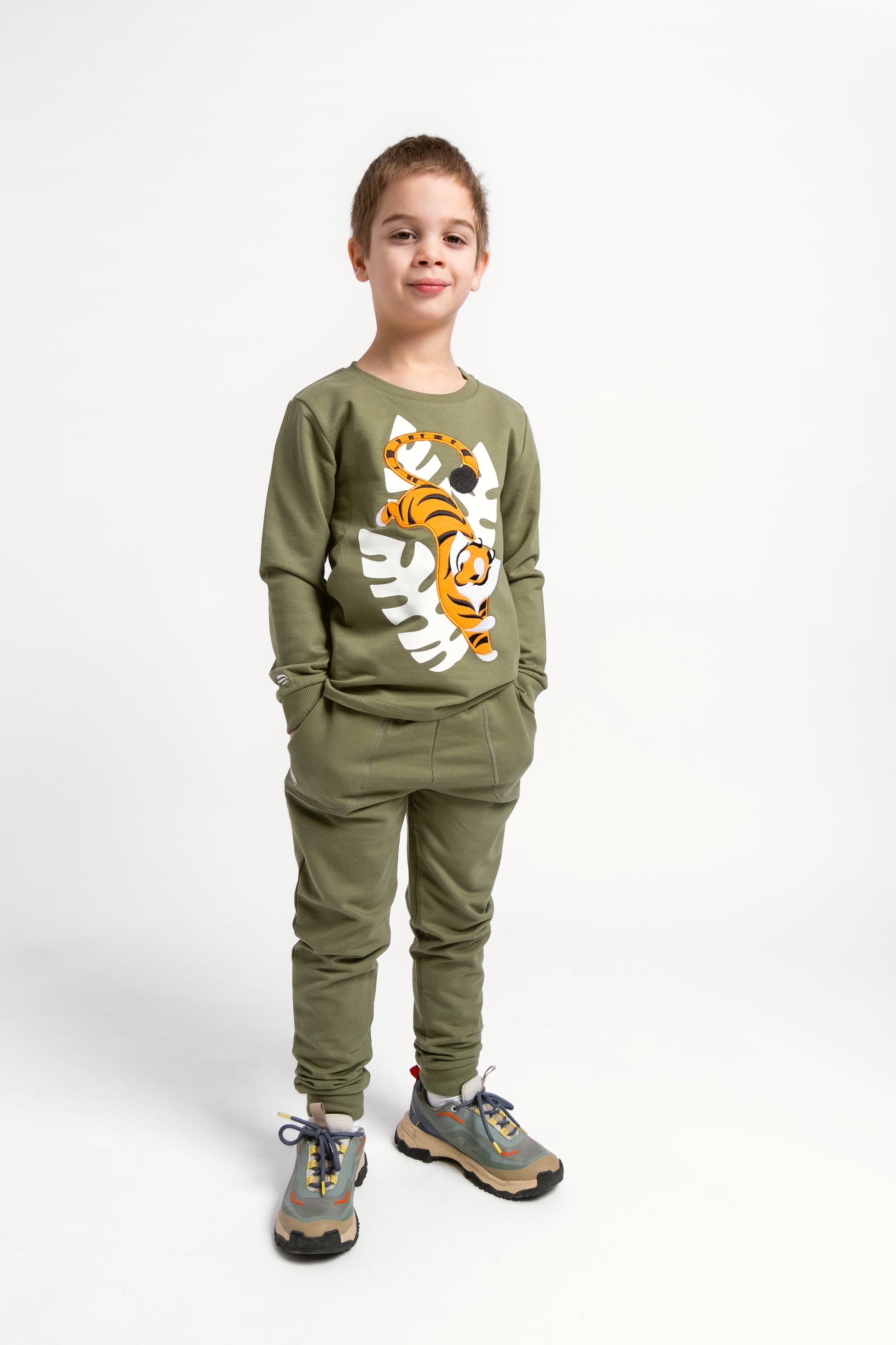 Long Sleeve T-Shirt with (Jumping Tiger) Applique embroidery - Olive