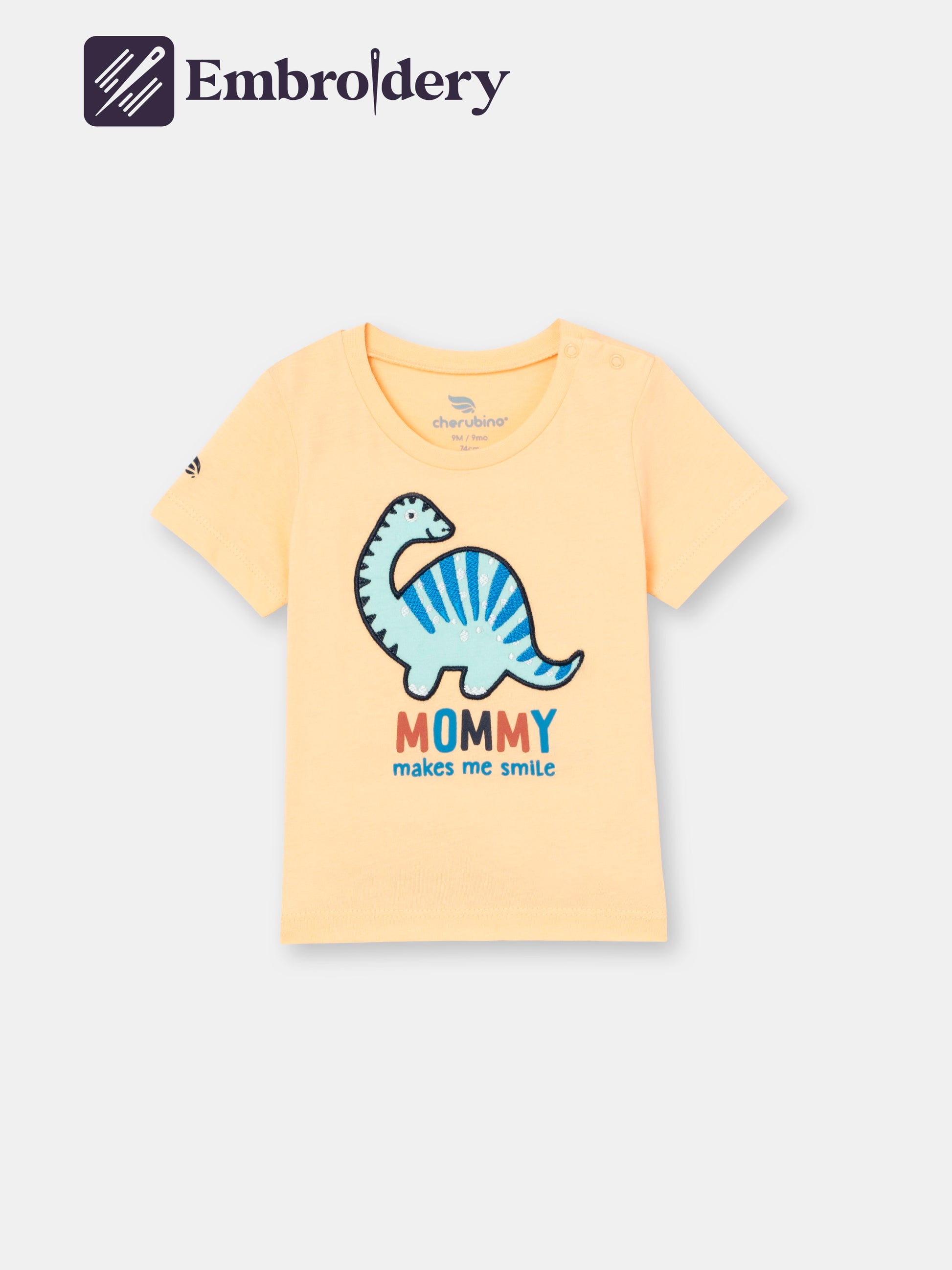 - Adorable Dino Design: Featuring an embroidered dinosaur with the text "Mommy makes me smile," these t-shirts add a touch of whimsy and love to your baby's outfit.